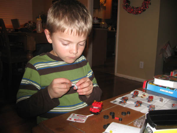 Adam works on a Lego car (not sure