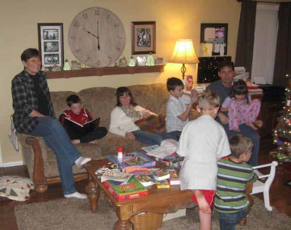 unidentified baby-doll, Grandma Cheryl, John, Noah, and Adam